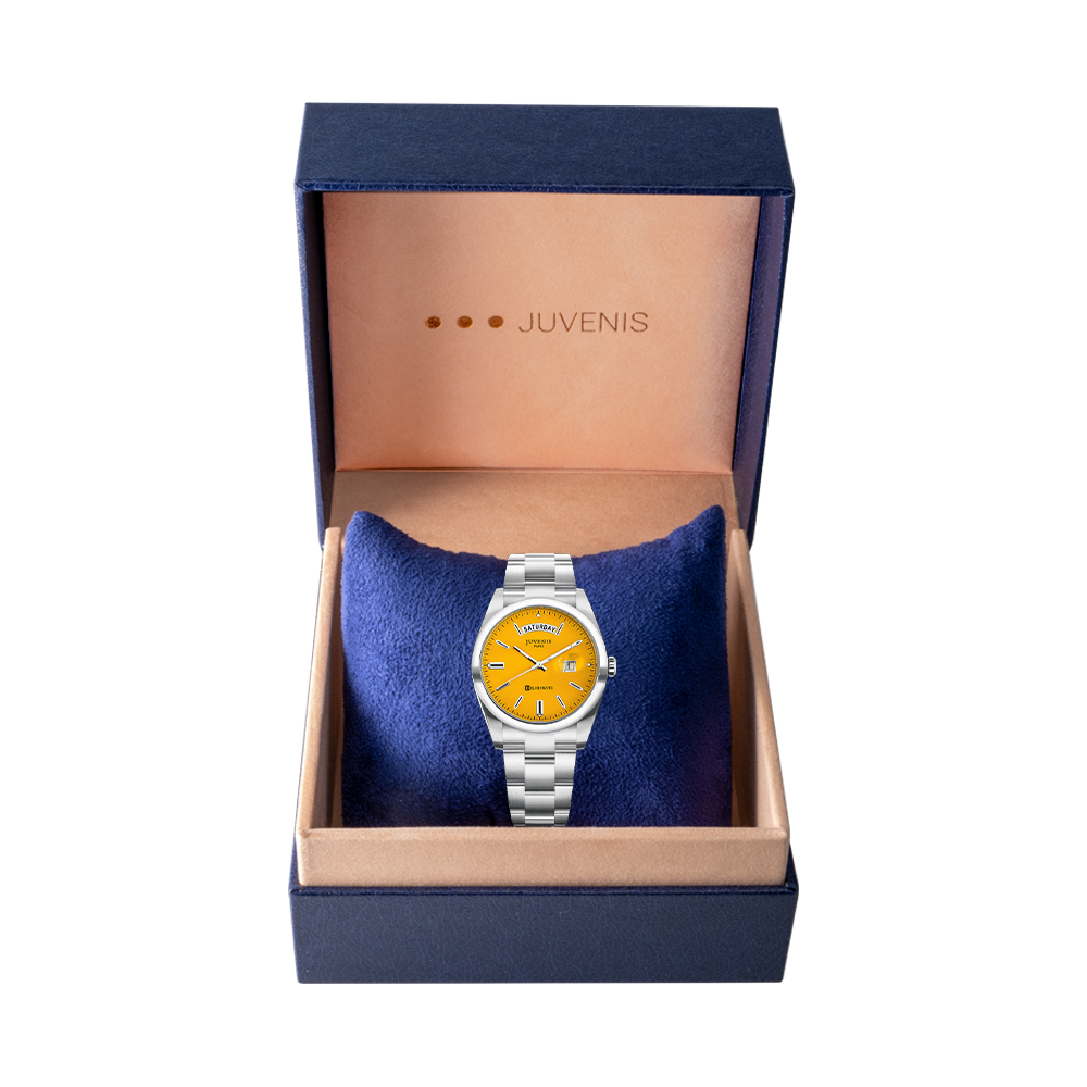 Bring a touch of energy to your collection with the Juvenis Amber Radiance. Featuring a radiant orange dial within a sleek silver case, this timepiece is perfect for those who love vibrant, eye-catching designs. Powered by the dependable Japan Seiko VJ55 movement, it offers the best in accuracy and durability. Water-resistant up to 3 ATM, the Amber Radiance is versatile enough for any occasion. Whether you're dressing up or keeping it casual, this watch will elevate your look with its bold color and reliable performance.
