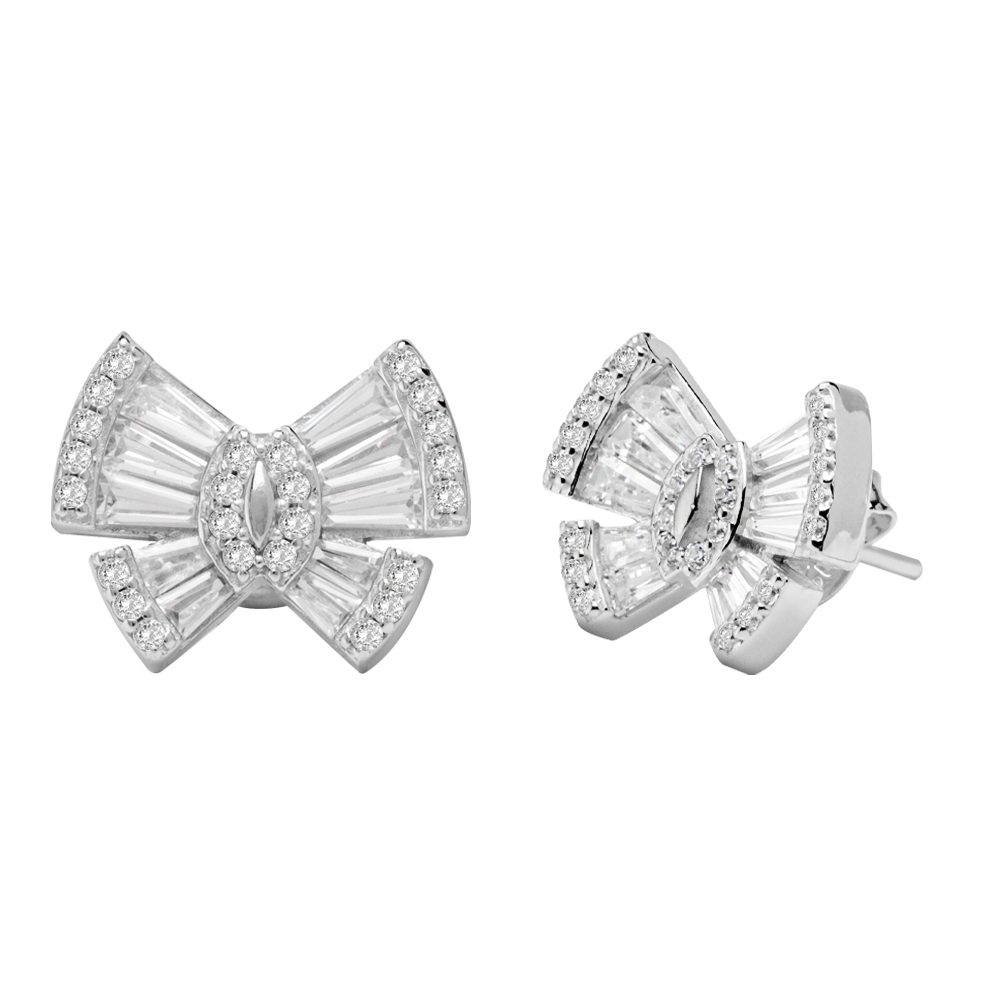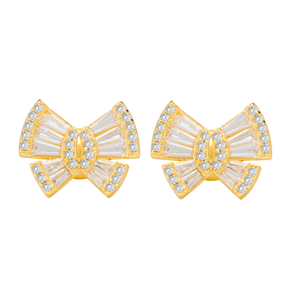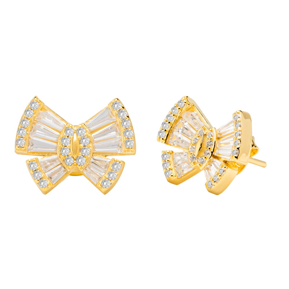 Juvenis Bow-type Earrings, a symbol of truth, elegance, and guidance. These delicate earrings are dynamic and eye-catching accessories to adorn your ears with beautiful ornaments. The gems in these fabulous earrings are attached with ten Zircon gems to make their reflections as shiny as the moonlight chains. Juvenis Bow-type Earrings are gold-plated over silver with a spring-ring buckle.