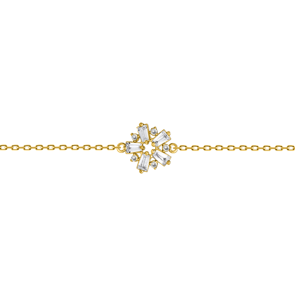 A nicely crafted bracelet from Juvenis, a bracelet with a pentagon flower adorned with ten shiny zircon gems decorating the flower. The bracelet band has additional two zircon gems on the sides of the flower.This Juvenis bracelet is made for a woman who likes adventure and wants to complete her own stylish trends. The Bracelet is gold-plated over silver with a spring ring buckle.