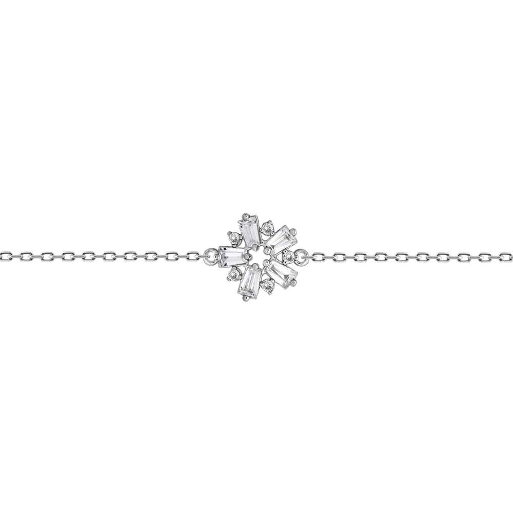 A nicely crafted bracelet from Juvenis, a bracelet with a pentagon flower adorned with ten shiny zircon gems decorating the flower. The bracelet band has additional two zircon gems on the sides of the flower.This Juvenis bracelet is made for a woman who likes adventure and wants to complete her own stylish trends. The Bracelet is Rhodium-plated over silver with a spring-ring buckle.