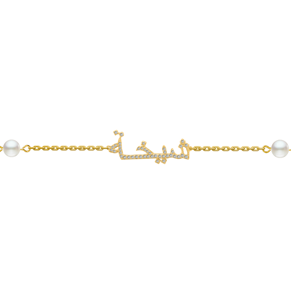 Juvenis crafted this fabulous bracelet resembling the princess, the lady, and the noblewoman whose name is Sheikha. A great and honorable name is sculpted in the middle of two gold-plated over silver bands that are adorned with two artificial pearls to give the bracelet a sense of delicacy. Sheikha�s name is decorated with zircon gems, giving the name a shiny aspect. Juvenis Sheikha Arabic Name Zirconed Bracelet is a new way of expressing the elegancy when the wearer is proud of the Arabic Names.