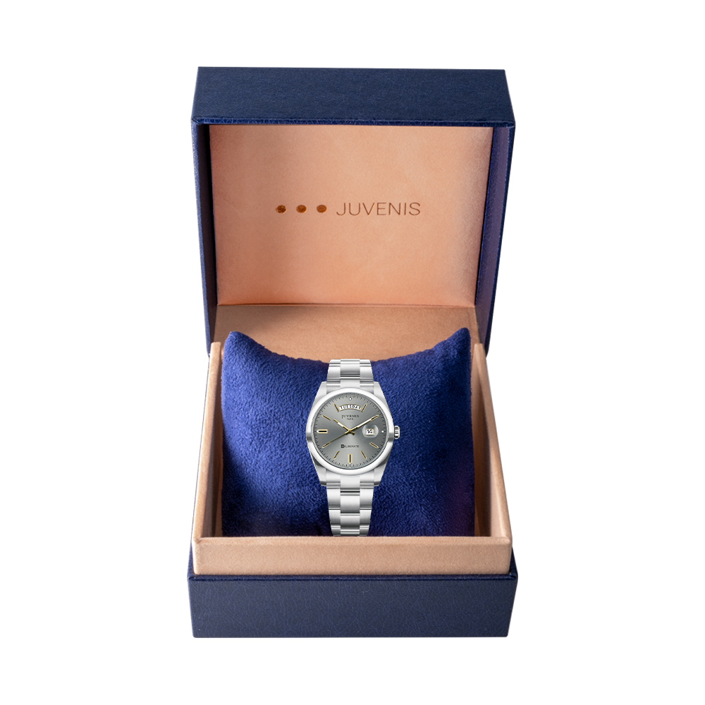 The Juvenis Slate Echo is the epitome of subtle elegance, combining a warm grey dial with a polished silver case for a minimalist yet sophisticated look. This watch is powered by the renowned Japan Seiko VJ55 movement, ensuring precision and reliability. Water-resistant up to 3 ATM, it?s built for durability while maintaining a sleek aesthetic. Perfect for both formal and casual occasions, the Slate Echo is a versatile timepiece that exudes class and confidence.