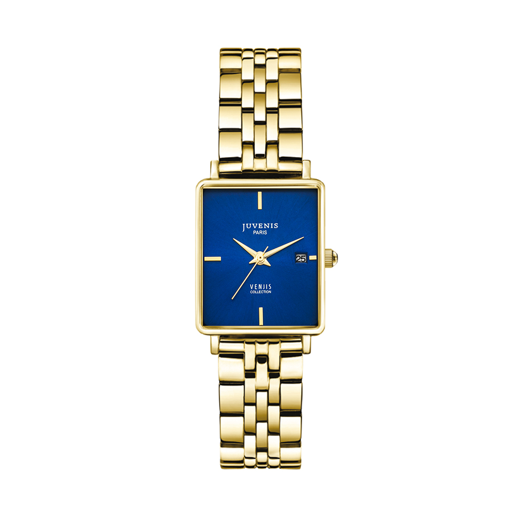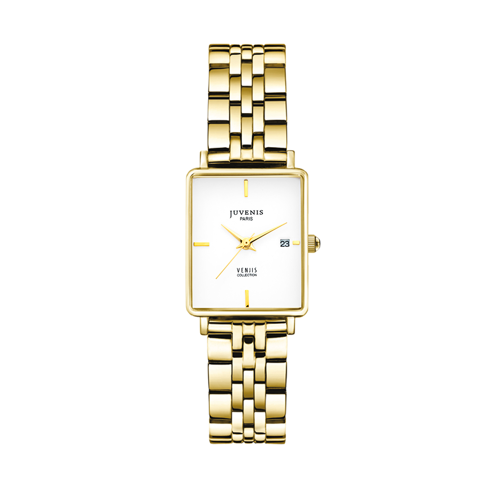 Elevate your style with the Venjis Gold Sunray Square watch from the Juvenis Paris Venjis collection. This exquisite timepiece boasts a square gold case that exudes sophistication and modernity. The captivating Tiffany sunray dial, adorned with a four bars index, ensures effortless time reading in any setting. Powered by a precise Japanese movement, this watch offers reliable timekeeping, while the date window at 3 o'clock adds practicality to its design. Crafted with a durable mineral glass and a stainless steel band secured with a push-button closure, the Venjis Gold Sunray Square watch combines durability with style. With a water resistance of 3 ATM and a 1-year warranty, it's the perfect accessory for discerning individuals who appreciate both luxury and functionality.